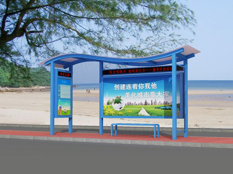 公交車候車亭一般是與公交站牌相配套的,為方便公交乘客候車時遮陽、防雨等,在車站、道路兩旁或綠化帶的港灣式公交停靠站上建設的交通設施。由于城市公交的日益發達,候車亭已發展成為城市一個不可或缺的重要組成部分,設計精美的候車亭也成為了城市一道美麗的風景。 一般候車亭棚體主要頂棚、立柱、頂弓、廣告燈箱和坐凳組成,也有用隔板來代替廣告燈箱的。