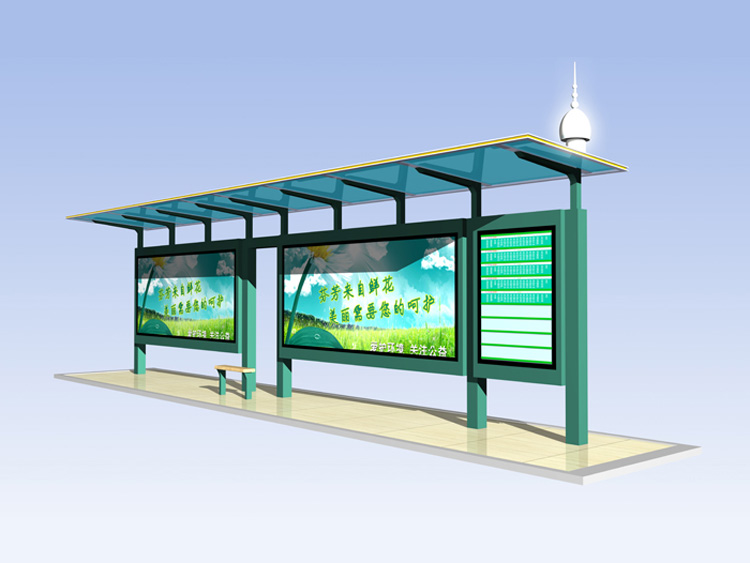 公交車候車亭一般是與公交站牌相配套的,為方便公交乘客候車時遮陽、防雨等,在車站、道路兩旁或綠化帶的港灣式公交停靠站上建設(shè)的交通設(shè)施。由于城市公交的日益發(fā)達,候車亭已發(fā)展成為城市一個不可或缺的重要組成部分,設(shè)計精美的候車亭也成為了城市一道美麗的風(fēng)景。 一般候車亭棚體主要頂棚、立柱、頂弓、廣告燈箱和坐凳組成,也有用隔板來代替廣告燈箱的。