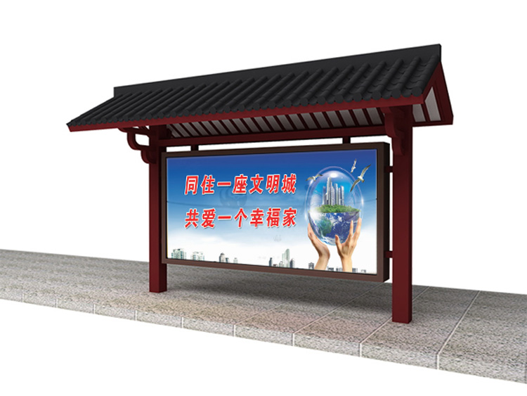 公交車候車亭一般是與公交站牌相配套的,為方便公交乘客候車時遮陽、防雨等,在車站、道路兩旁或綠化帶的港灣式公交停靠站上建設的交通設施。由于城市公交的日益發達,候車亭已發展成為城市一個不可或缺的重要組成部分,設計精美的候車亭也成為了城市一道美麗的風景。 一般候車亭棚體主要頂棚、立柱、頂弓、廣告燈箱和坐凳組成,也有用隔板來代替廣告燈箱的。